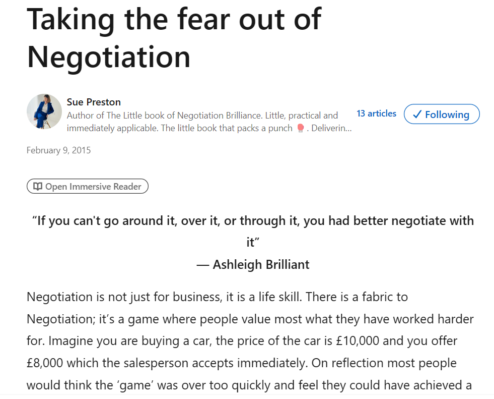 Sue Preston is an exceptional professional whose expertise in negotiations is well knowns. Having recently co-delivered a three-day negotiation course alongside her, I was thoroughly impressed by her deep knowledge, practical approach, and ability to engage and inspire attendees. Sue’s contributions were pivotal in the success of the course, and her skills in negotiation are a definite asset to any team or project. I highly recommend Sue for her professionalism, expertise, and genuine dedication to excellence in negotiation field.